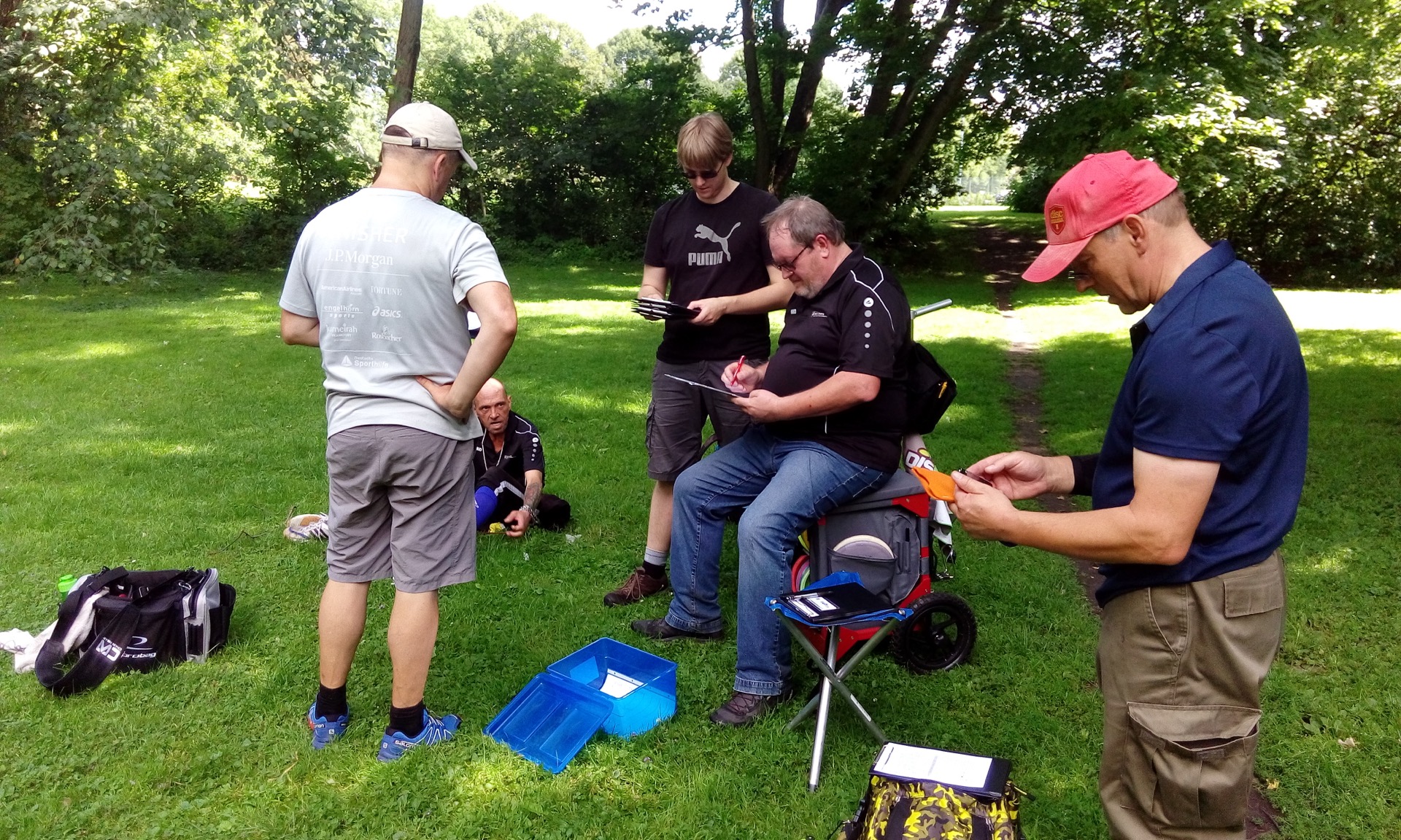 Der Flight von Nik war auch noch der Schnellste; in diesem Fall nicht unbedingt ein Vorteil. Die Wartezeit wurde nämlich ausnahmsweise nicht durch das Feierabend-Bier erleichtert, denn Holger Hielscher, der sich sonst immer so zuverlässig um die Getränke nach der Runde kümmert, weilt im wohlverdienten Urlaub. Zwar wollte Turnierdirektor Manfred Mund die fehlenden Getränke, ebenso wie die vergessenen Scheiben des Sponsors tapfer auf seine Kappe nehmen, aber so eine richtige Anti-Manni Stimmung wollte sich nicht einstellen. Abgesehen davon, dass das sowieso undenkbar ist, hatte er auch noch eine gute Entschuldigung parat: er hatte zu Hause „die Bude voll“. Während die Einen noch rätselten, was er damit gemeint haben könnte, war den anderen sofort klar: er musste in Wolfenbüttel die Oker durch sein Haus umgeleitet haben, damit in Braunschweig heute Discgolf gespielt werden konnte.
