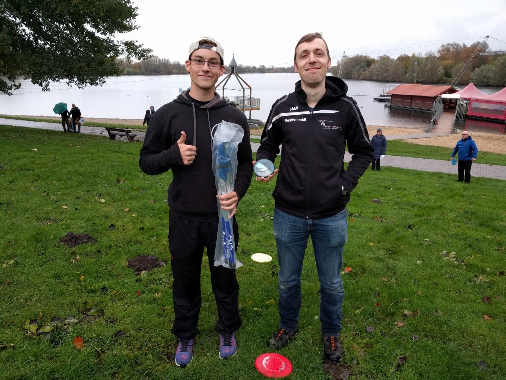 So kam es, dass sich trotz des wirklich besch..eidenen Wetters 50 Kontrahenten einfanden und den widrigen Umständen trotzten. Basket Dash war aber unter diesen Bedingungen auch gesundheitlich nicht zu verantworten. Den CTP-Preis von Bahn 6 angelte sich Tobi Lülf mit 2,16 m und nach dem Turnier ging es im "Sonnendeck" – bei dem Wetter muss man das in Anführungszeichen setzen – weiter mit dem Pubquiz. Tobis anfängliche Vorstellung, sich sämtliche Preise unter den Nagel zu reißen nahm hier ein jähes Ende. Er konnte aber seinen Team-Kollegen Fabian Kaune als Schuldigen ausmachen, weil er als selbst ernannter Discmania-Experte eine FD nicht von einer FD2 unterscheiden konnte. So fehlten die entscheidenden Punkte um beim Führungs-Trio mitzuhalten.