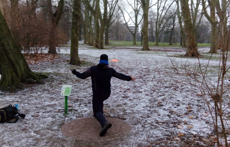 TD Andreas Hördt vom gastgebenden MTV Braunschweig ließ die Teilnehmer dann auch nicht lange fröstelnd warten, er gab trotz anderslautenden Forderungen nur einen kurzen Einblick in die letztlich erfolgreiche Entstehung des jüngsten Parcours in der diesbezüglich ohnehin verwöhnten Region zwischen Harz und Heide. Bemerkenswert dabei, der Parcours ist in seinen Grundzügen die Wiege des Disc-Golf in Braunschweig. Einige der Anwesenden haben vor über 20 Jahren dort bereits auf Objekte gespielt und sogar eine Deutsche Meisterschaft hat 1997 dort bereits stattgefunden.