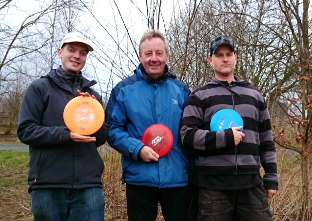 IMG 20150329 WA0005...ist kein Jazz-Trio aus den 70ern, sondern sind die drei besten Discgolfer des SONentour-Events in Ilsede 2015. Michael Schulenburg hatte mit dem unfreundlichen Wetter von allen Spielern am wenigsten Probleme und spielte auf dem Parcours mit dem rostigen Ambiente eine solide 51. „Die Schmidts" (diese Band gab es wirklich) teilten sich mit 54 Würfen den zweiten Platz. Auf Platz 4 landete Andreas Hördt (56). Dann folgten einige auf Platz 5, deren Namen der Autor vergessen hat.